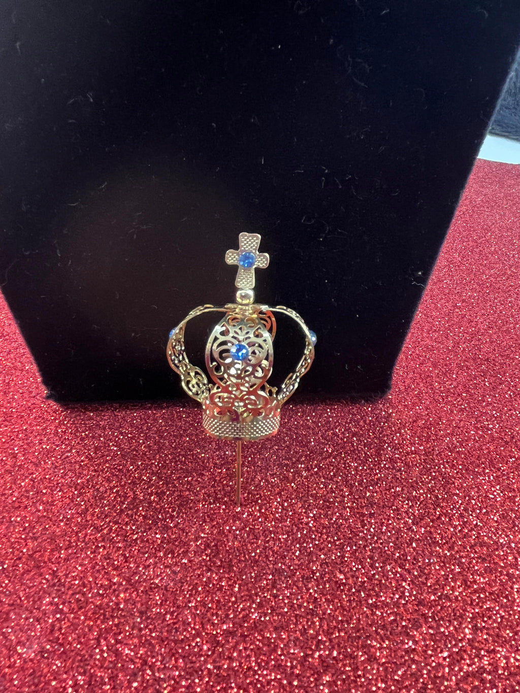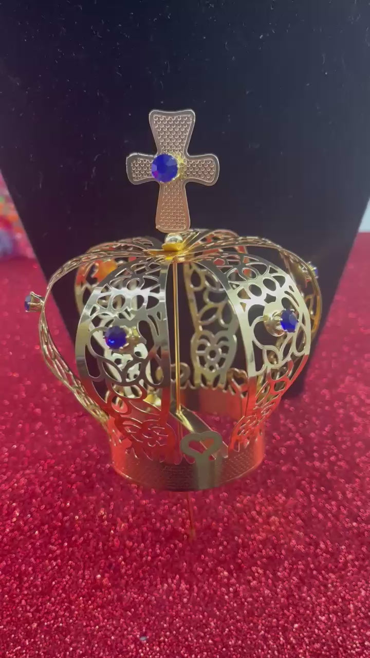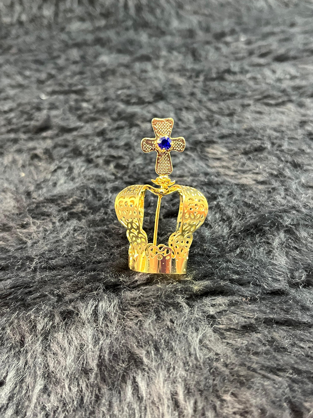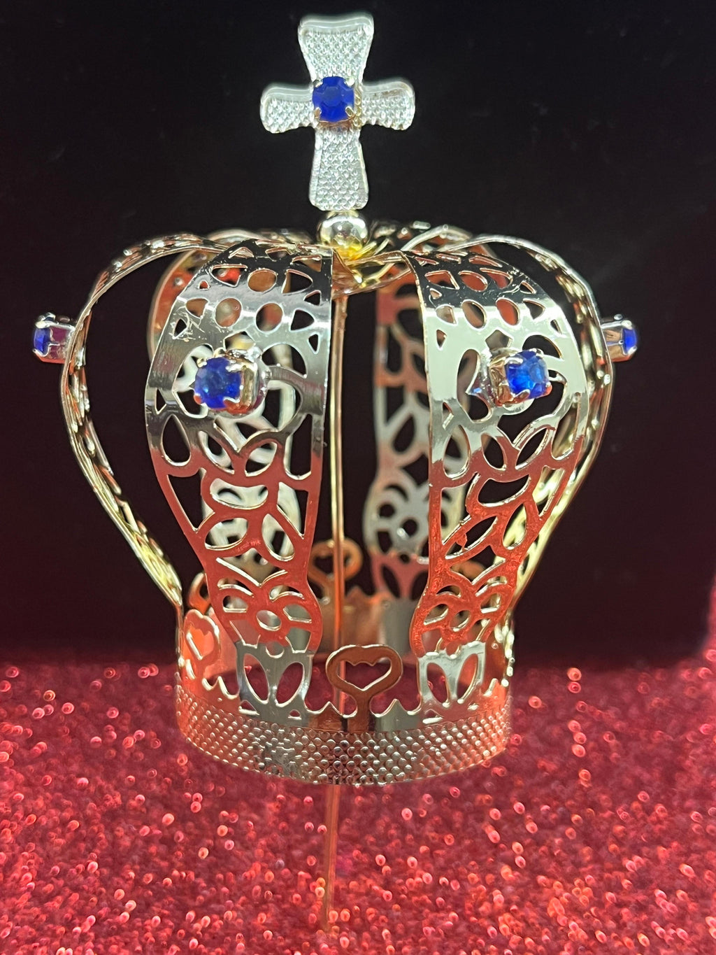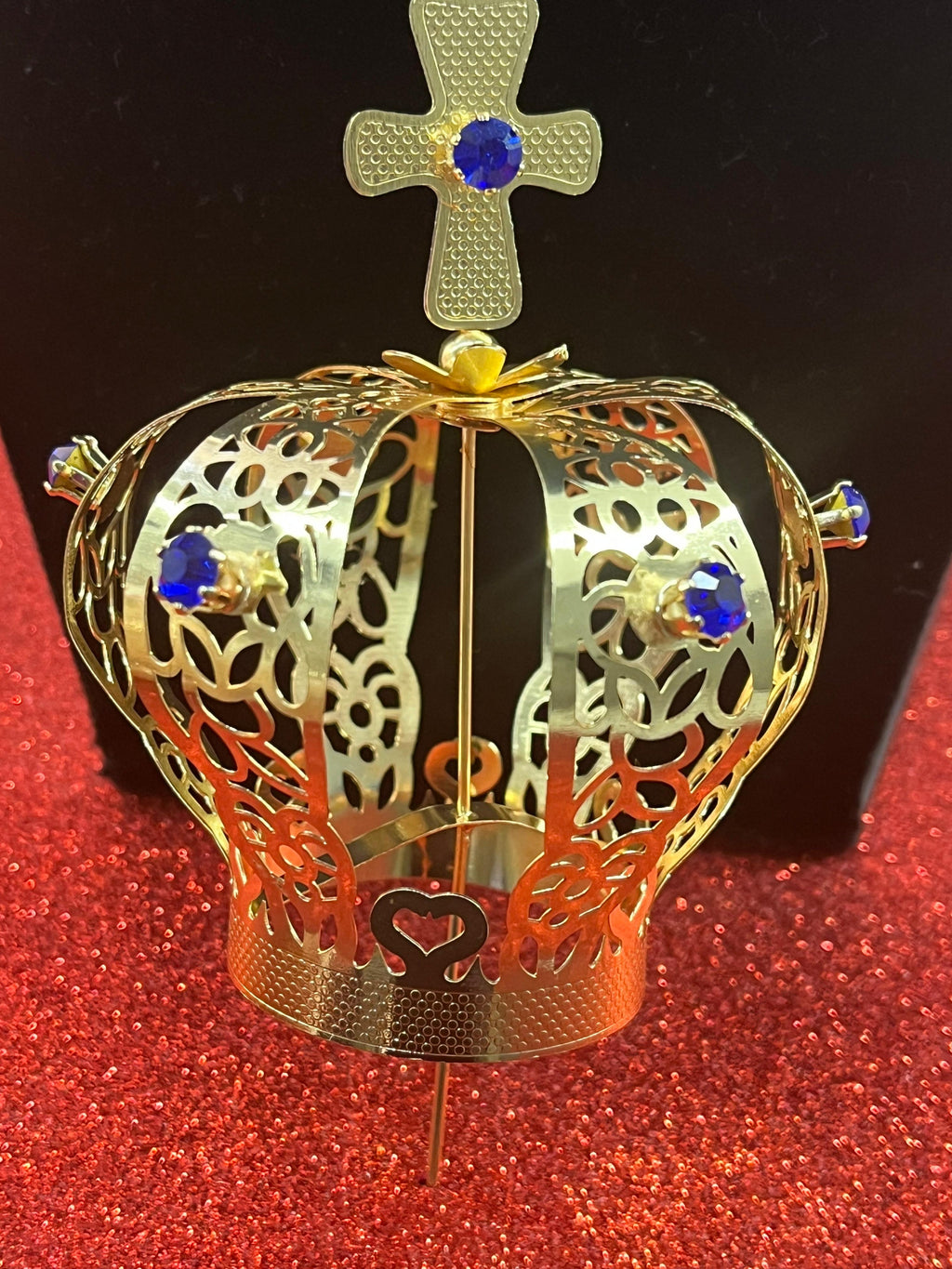 Coroa Artesanal Decorada produzida em metal com banho dourado e pedras azuis e pino central também em metal para encaixar na imagem. Aconselhamos ir pelo tamanho da sua imagem ou medir o diâmetro da cabeça da imagem para ter um tamanho mais preciso. A Coroa Artesanal Decorada tem vários tamanhos diferentes para que você escolha qual melhor se adequa às suas necessidades.