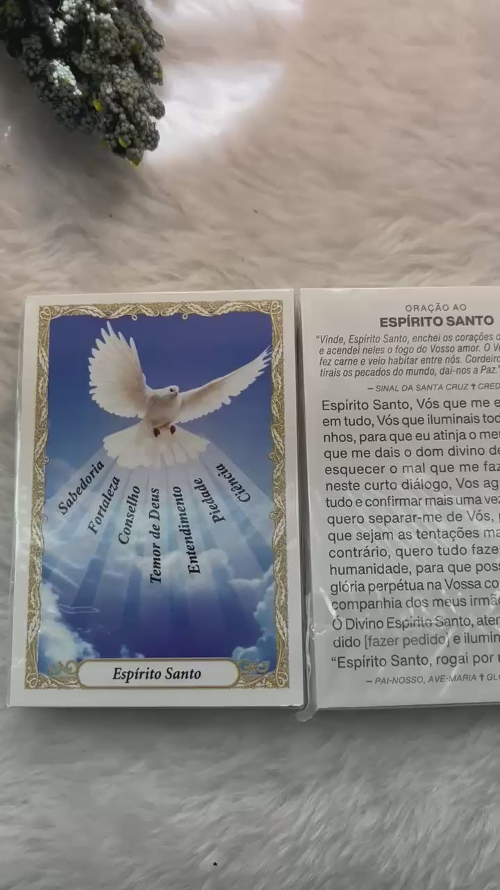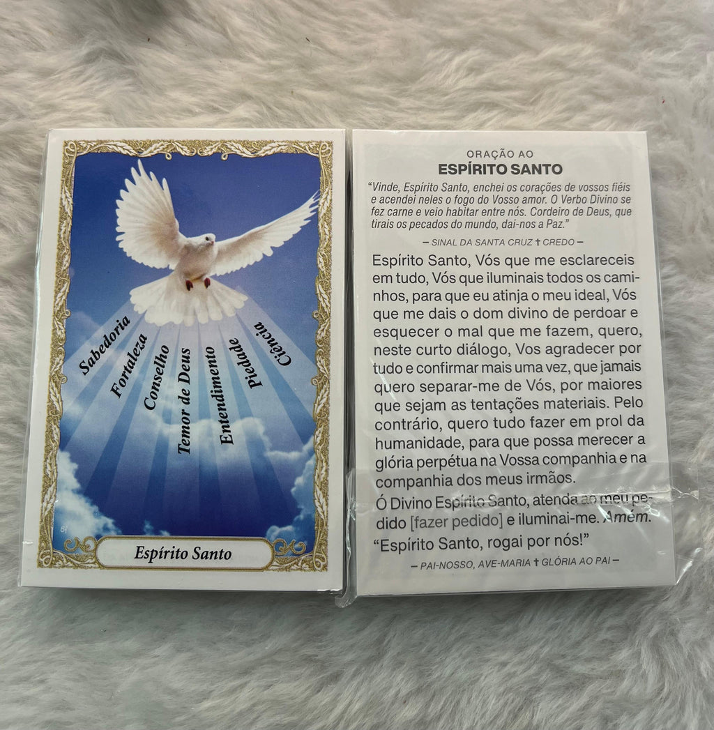 Deixe a fé e a proteção do Divino Espírito Santo estarem sempre com você com esse pacote de 100 santinhos de papel. Cada um contém uma poderosa oração ao Espírito Santo, proporcionando paz e proteção para a sua vida. Um símbolo de devoção e esperança em azul.