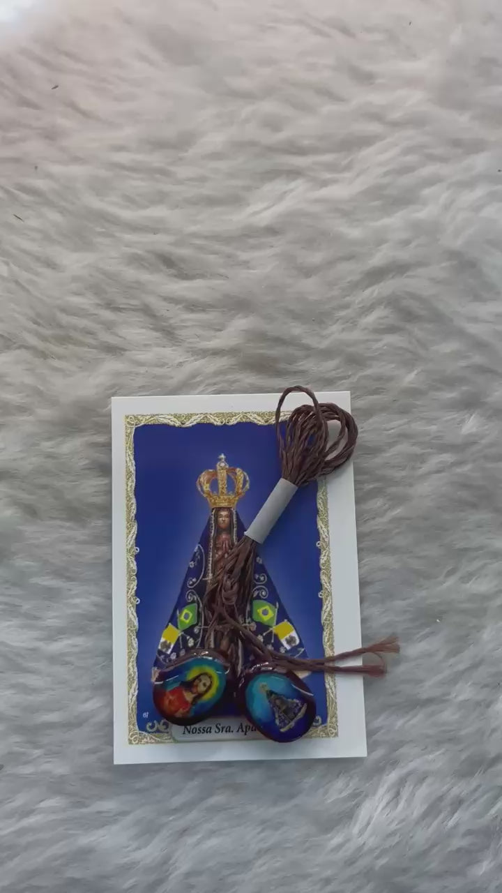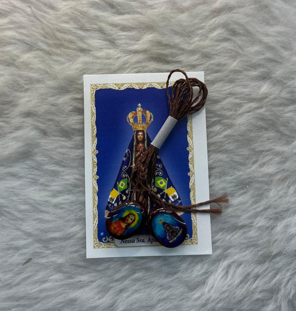"Escapulário em acrílico com cordão, trazendo as imagens de Nossa Senhora do Carmo e Nossa Senhora Aparecida. Símbolo de fé, proteção e devoção."