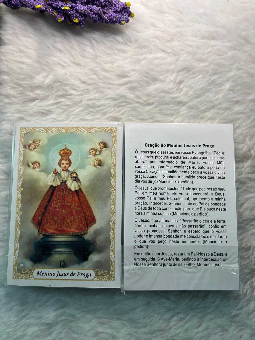 Aumente sua devoção com o pacote de 100 santinhos de papel do menino Jesus de Praga. Com uma poderosa oração impressa, sinta-se mais próximo do seu santo protetor. Ideal para presentear e espalhar a fé entre amigos e familiares.