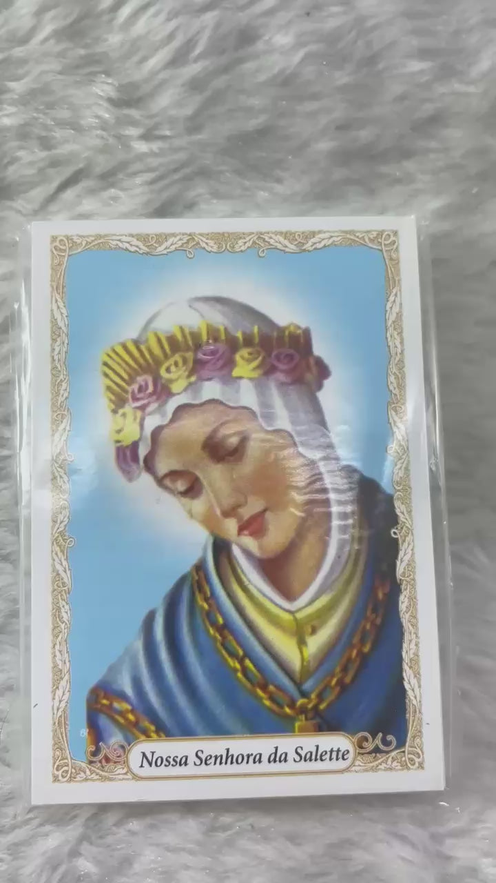 Santinho de papel de Nossa Senhora da Salette produzido em papel couché, feito com a imagem de Nossa Senhora da Salette e a oração no verso, a embalagem com o santinho de papel de Nossa Senhora da Salette contém 100 unidades.