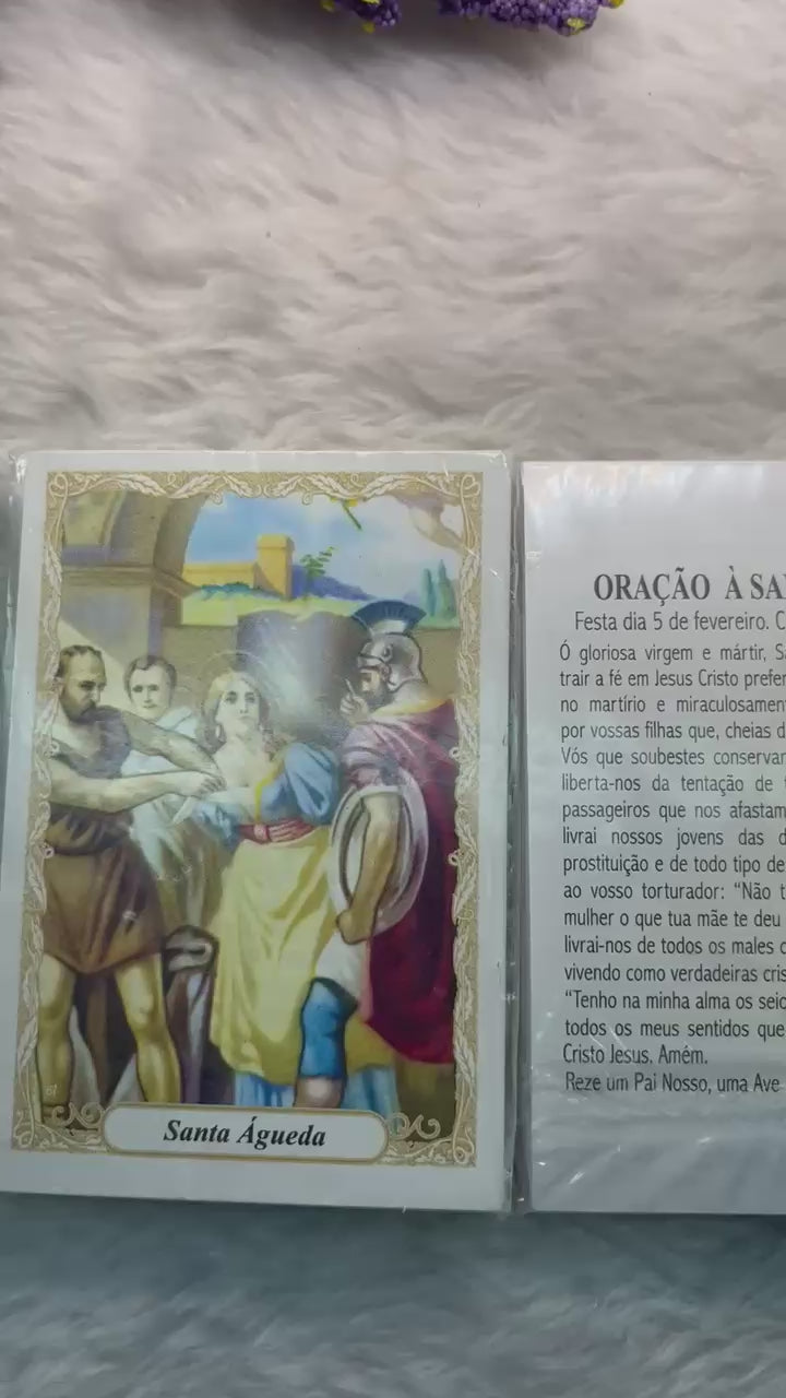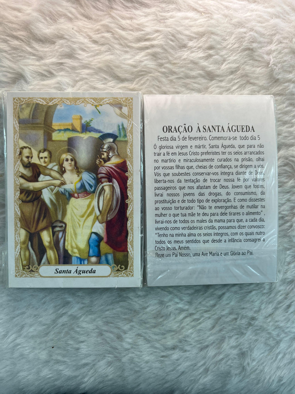 Leve com você a proteção de Santa Àgueda com este pacote de 100 santinhos de papel contendo uma poderosa oração. Com esses santinhos, você terá sempre à mão uma fonte de fé e proteção. Leve também para presentear aqueles que você ama.