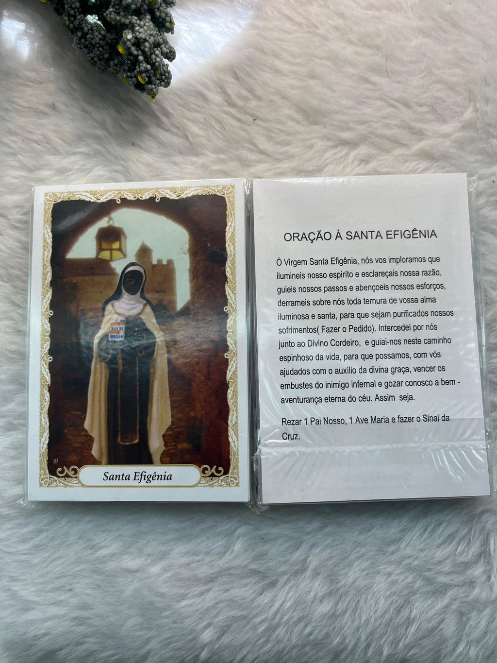 Santinho de papel de Santa Efigênia produzido em papel couché, feito com a imagem de Santa Efigênia e a oração no verso, a embalagem com o santinho de papel de Santa Efigênia contém 100 unidades.