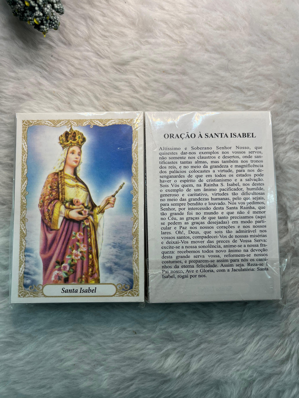 Santinho de papel de Santa Isabel produzido em papel couché, feito com a imagem de Santa Isabel e a oração no verso, a embalagem com o santinho de papel de Santa Isabel contém 100 unidades.