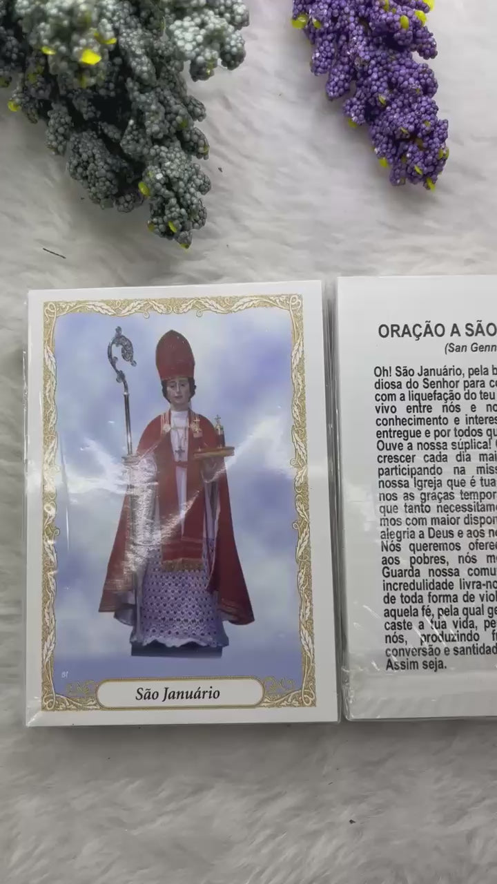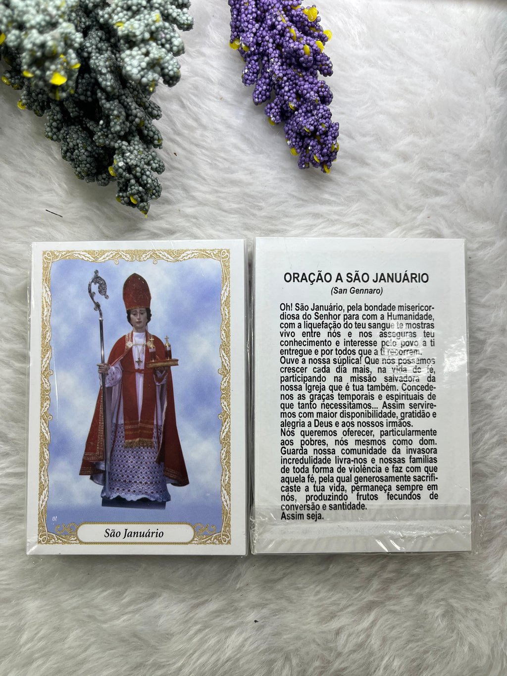 Santinho de papel de São Januário produzido em papel couché, feito com a imagem de São Januário e a oração no verso, a embalagem de com o santinho de papel de São Januário contém 100 unidades.
