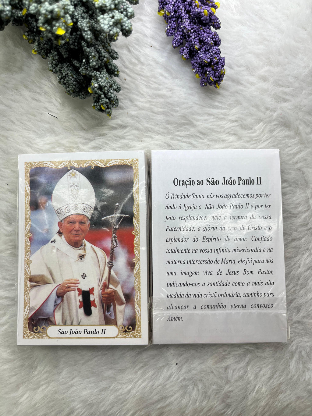 "Santinho de papel com oração de São João Paulo II, ideal para devoção, lembranças religiosas e momentos de fé."
